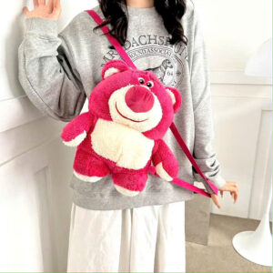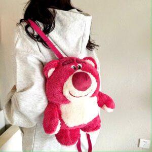 Hình dáng: Hình thú Lotso ôm trọn lưng, mặt gấu tươi cười, màu hồng nổi bật, quai đeo vai có thể điều chỉnh.
