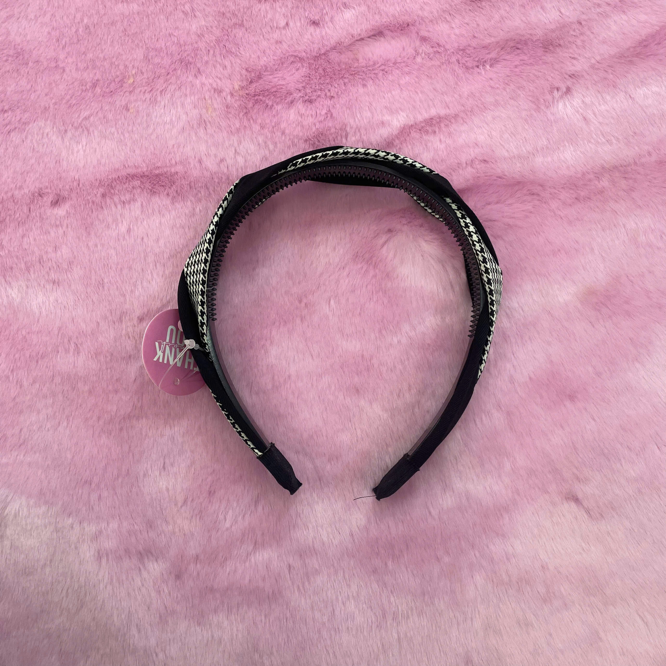 • Đặc điểm: Thiết kế xoắn độc đáo, họa tiết kẻ đen trắng nổi bật, chất liệu nhẹ và ôm sát đầu, không gây đau khi đeo lâu.