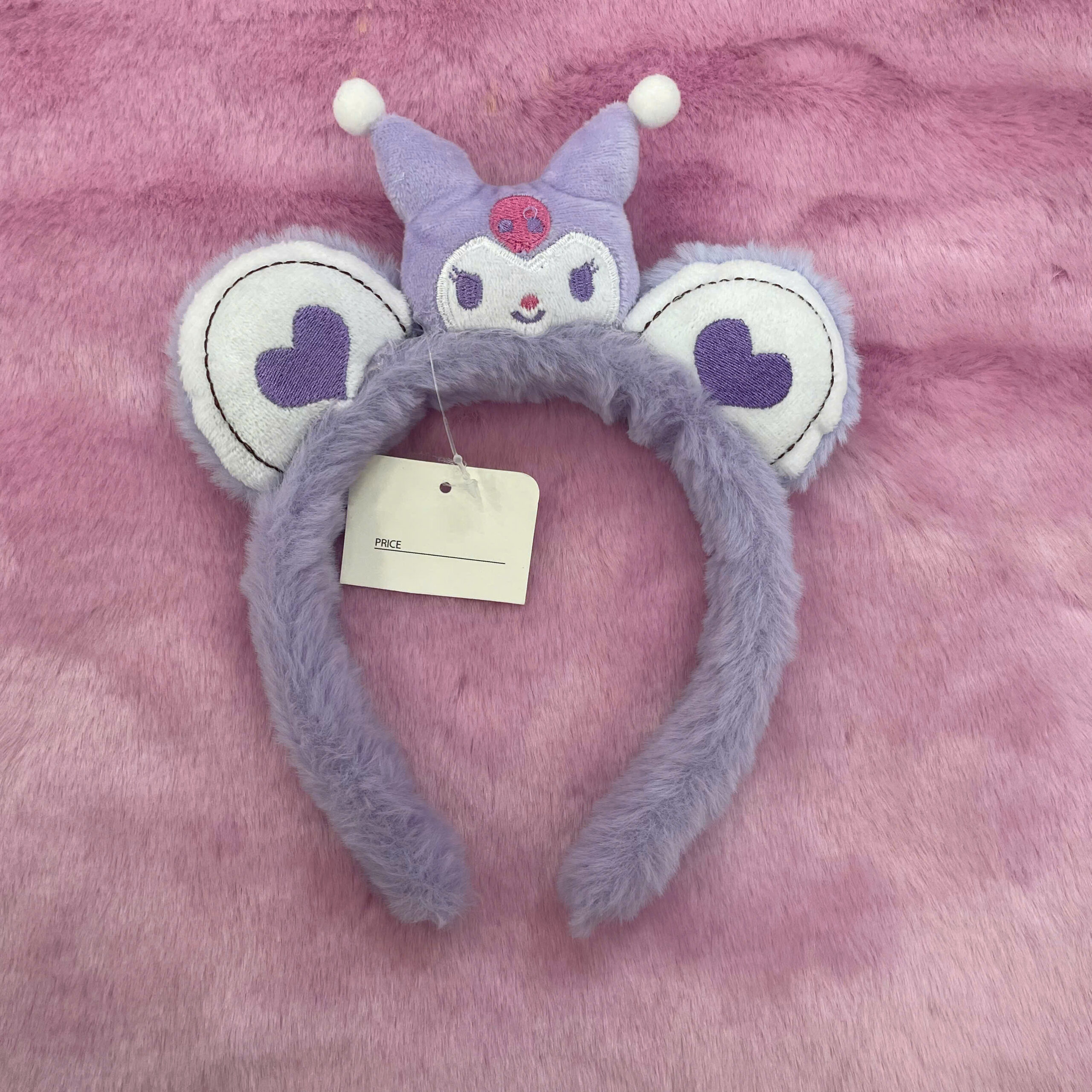 Cài tóc lông mềm màu tím pastel, thiết kế đáng yêu với hình Kuromi giữa hai tai tròn viền tim tím nổi bật.