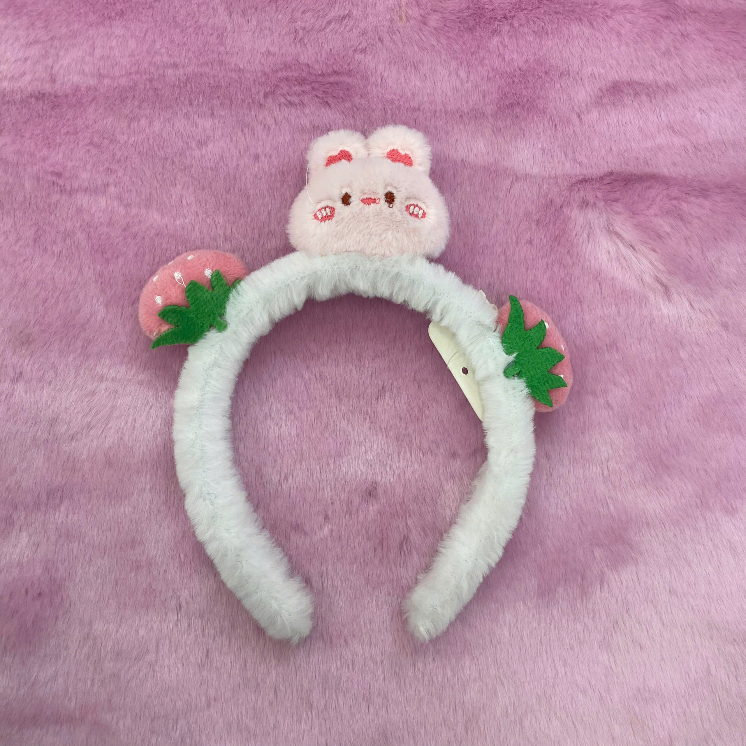 Cài tóc lông mịn hình thỏ trắng siêu dễ thương, kết hợp dâu tây hồng nổi bật hai bên tạo điểm nhấn ngọt ngào.