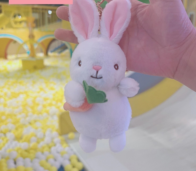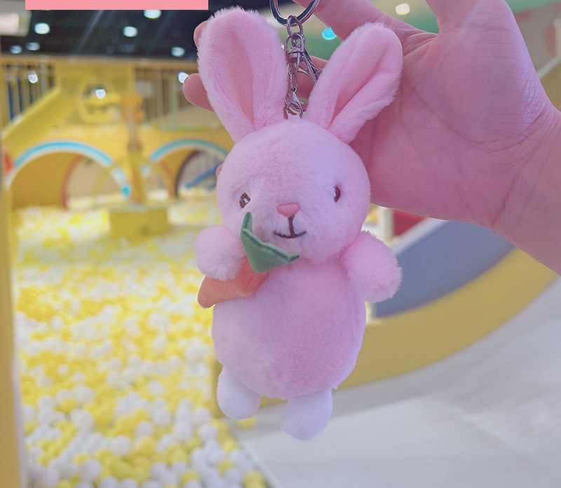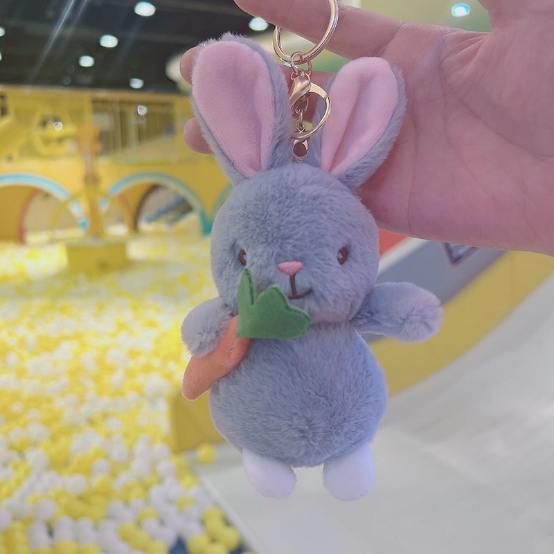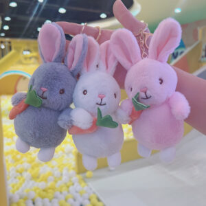 Móc khoá hình chú thỏ trắng, hồng, xám ôm củ cà rốt cam siêu dễ thương và nổi bật.